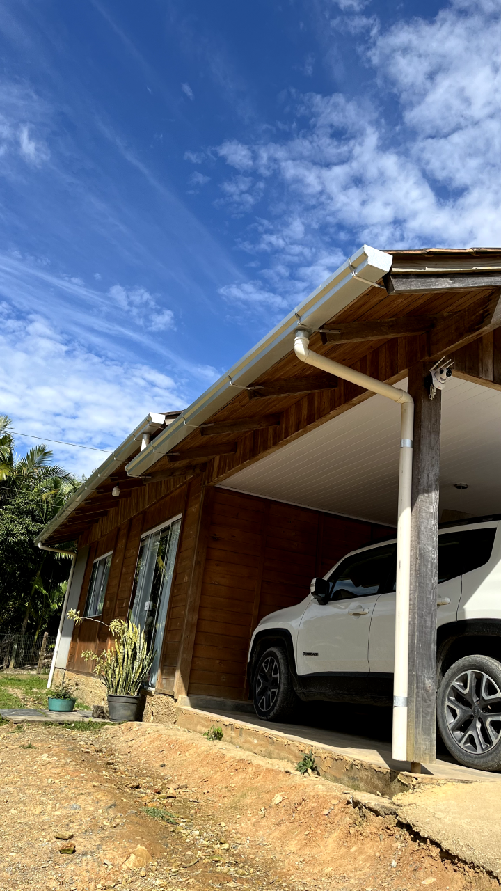 Descidas em cano e joelhos de PVC no tamanho de 75mm fixadas com abraçadeiras de aluzinco 0.43mm de espessura na cor natural (cinza) sem pintura;